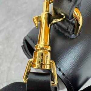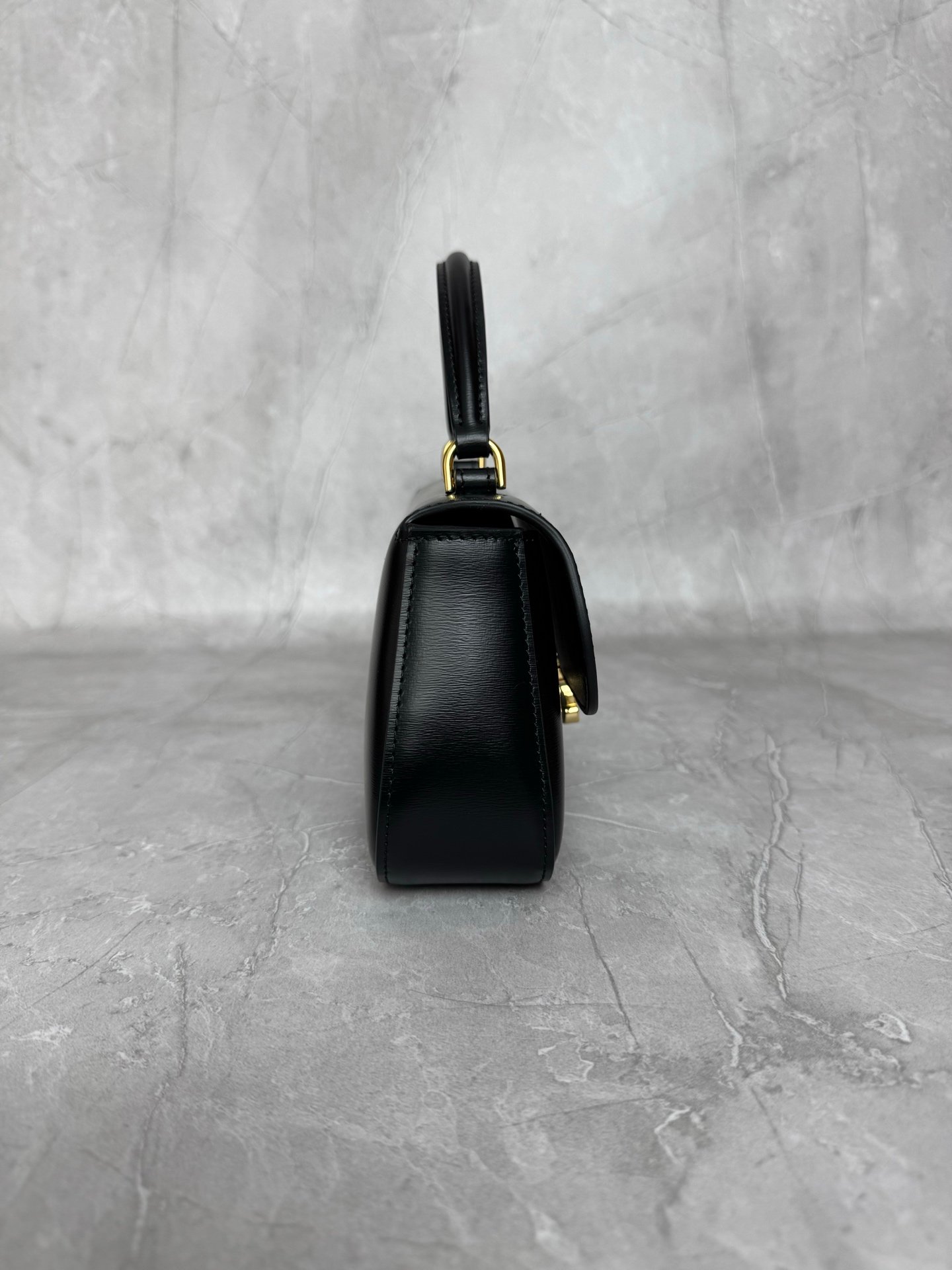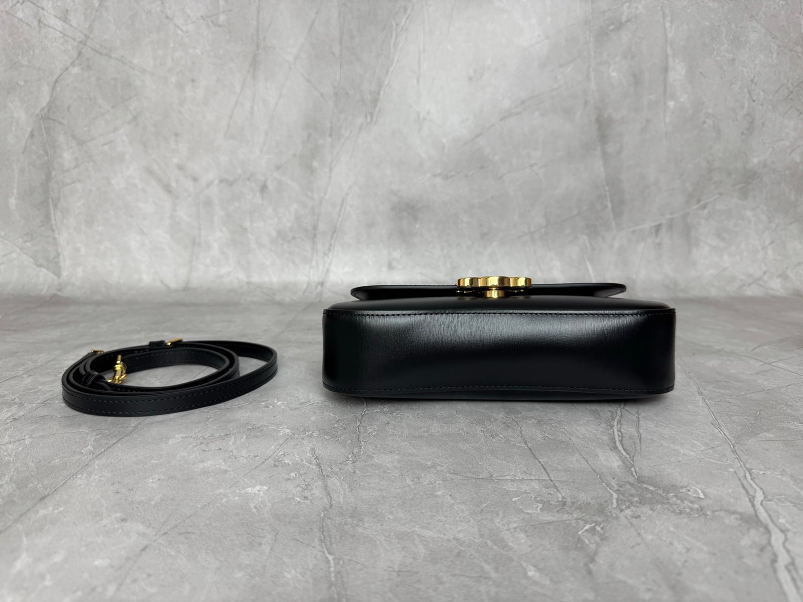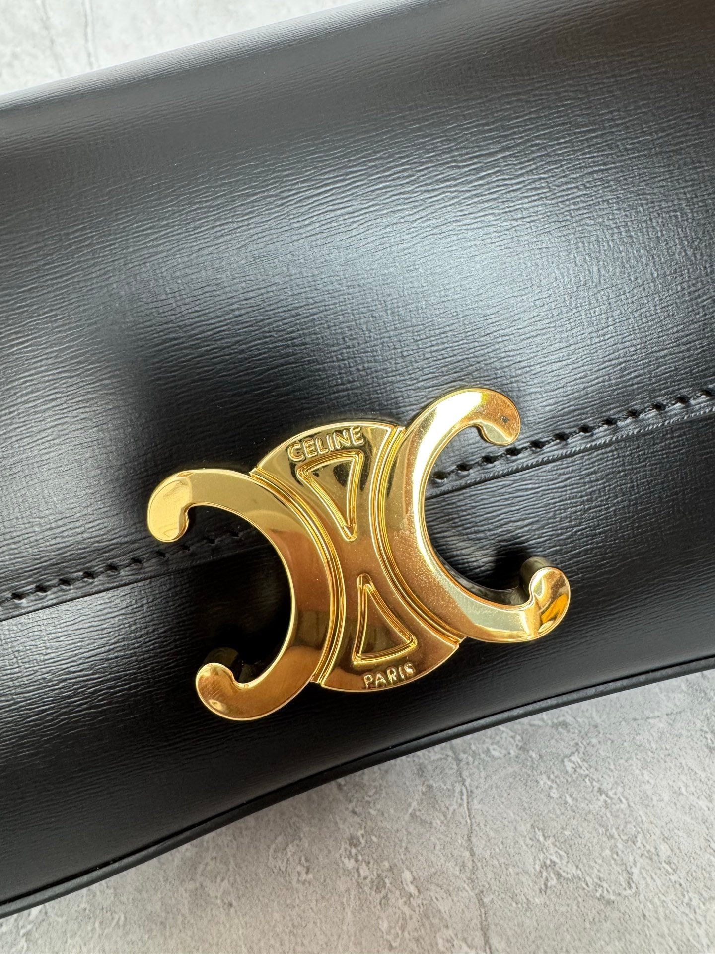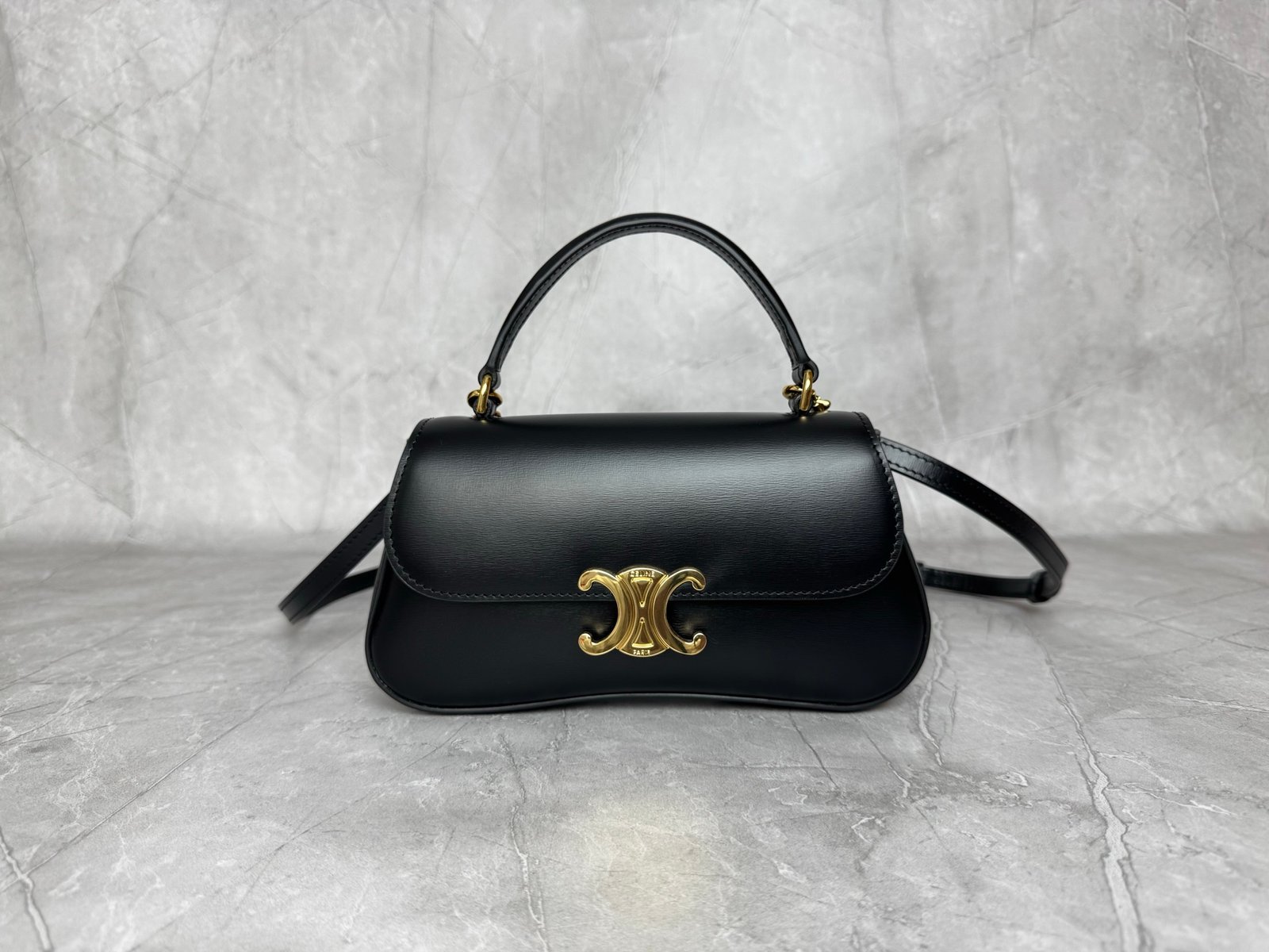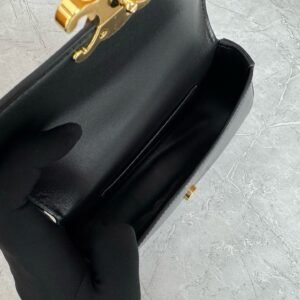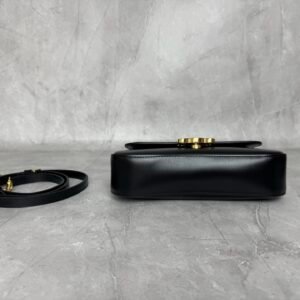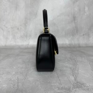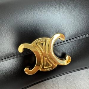 Mini baguette or Teen Triomphe bag in soft black shiny calfskin leather, featuring the brand’s signature gold-finished metal clasp.