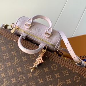 “Nano Speedy” Monogram Empreinte Snowy Pearl colorway Made from cowhide leather with silver-toned hardware and includes a removable charm.